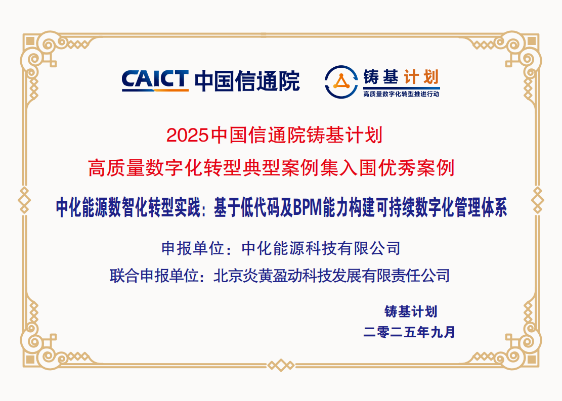 早在2004年,炎黄盈动率先完成了国家高技术研究发展863计划,流程中间件在NC(Network Computer)网络计算机的应用示范课题研究,作为信创工作委员会成员单位,持续推动信创落地进程。公司是中国信通院(低/无代码、数字化流程、中台、企业级人工智能应用)标准研制单位、数字化转型管理参考架构和能力体系建设、SOA、工作流国标的研制单位。