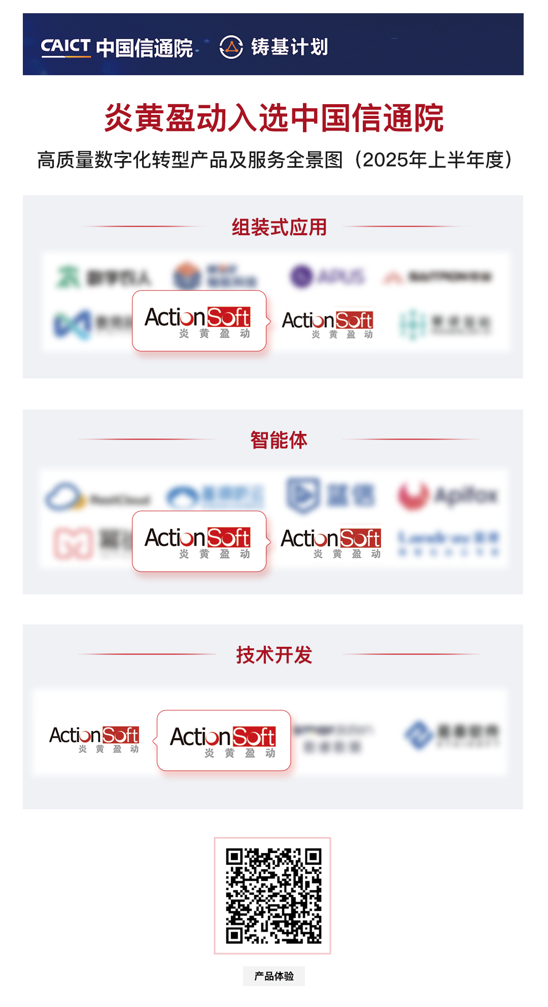 炎黄盈动最新一代以AI为驱动的AWS PaaS平台入选铸基计划全景图,并荣登“组装式应用、智能体、技术开发”三大核心领域的重点产品及服务供应商名录,权威印证了其在数智化转型服务领域的强劲实力。此外,炎黄盈动申报的基于流程驱动的MES系统解决方案入选《高质量数字化转型技术解决方案集(2025上半年度》。