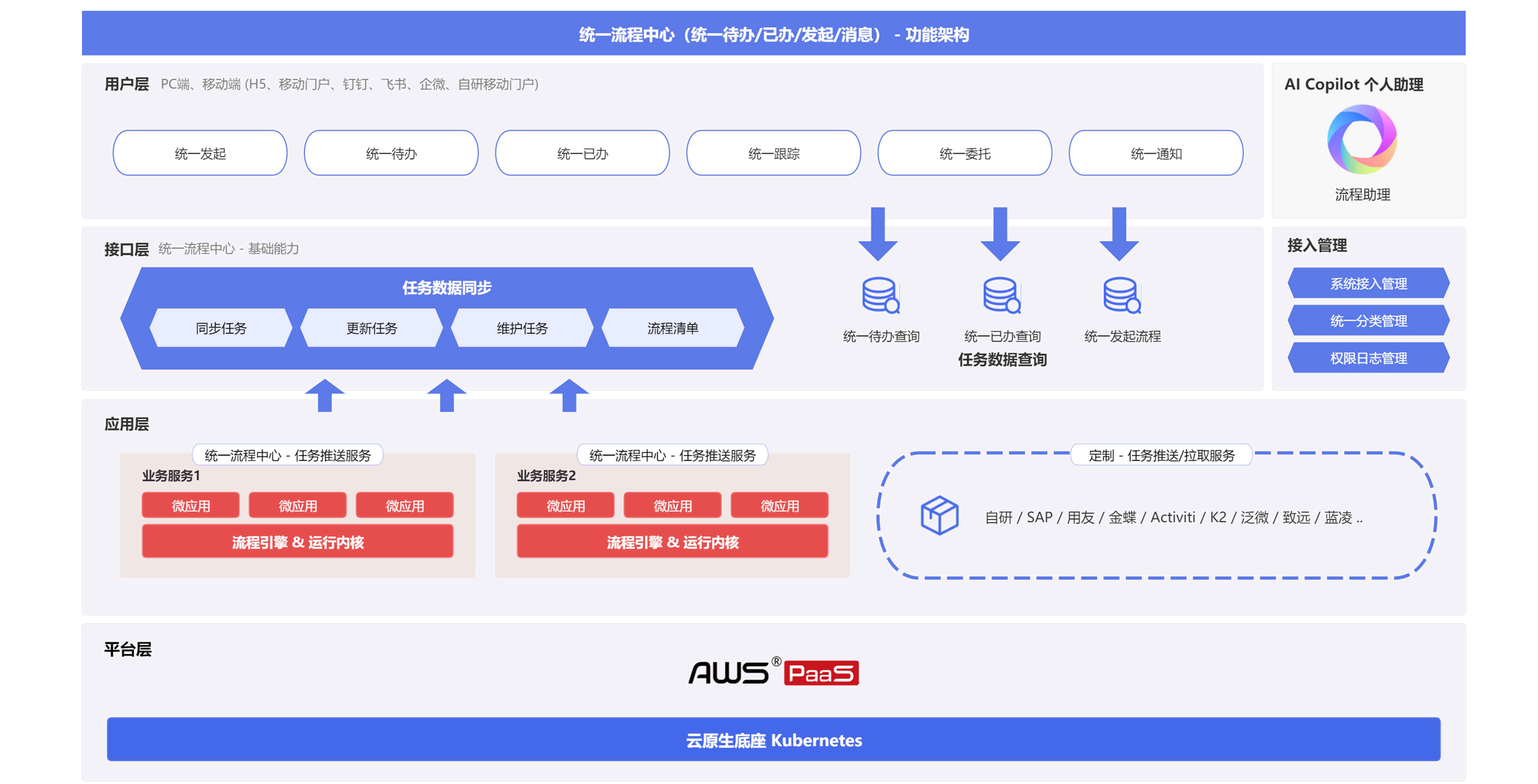 通过AWS aPaaS和iPaaS平台,开展统一流程引擎、统一流程中心的IT能力建设,数字化应用构建和深化迭代,保障底座平台的运行和日常维护管理。