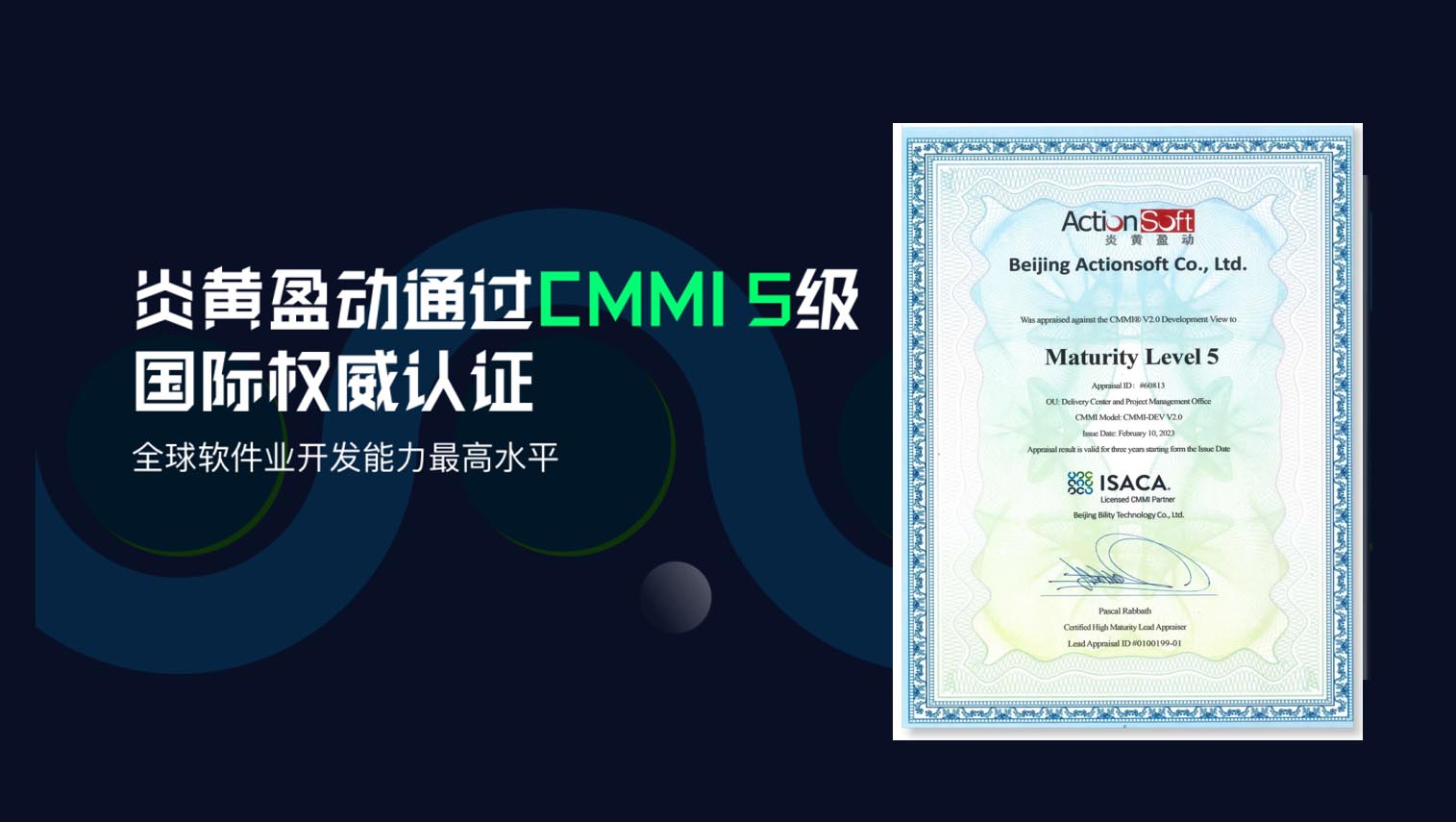 炎黄盈动通过全球软件领域最高级别CMMI-DEV V2.0管理成熟度五级评估认证。这代表了公司在软件研发能力成熟度、软件过程组织、项目管理及交付方面达到国际先进水平。