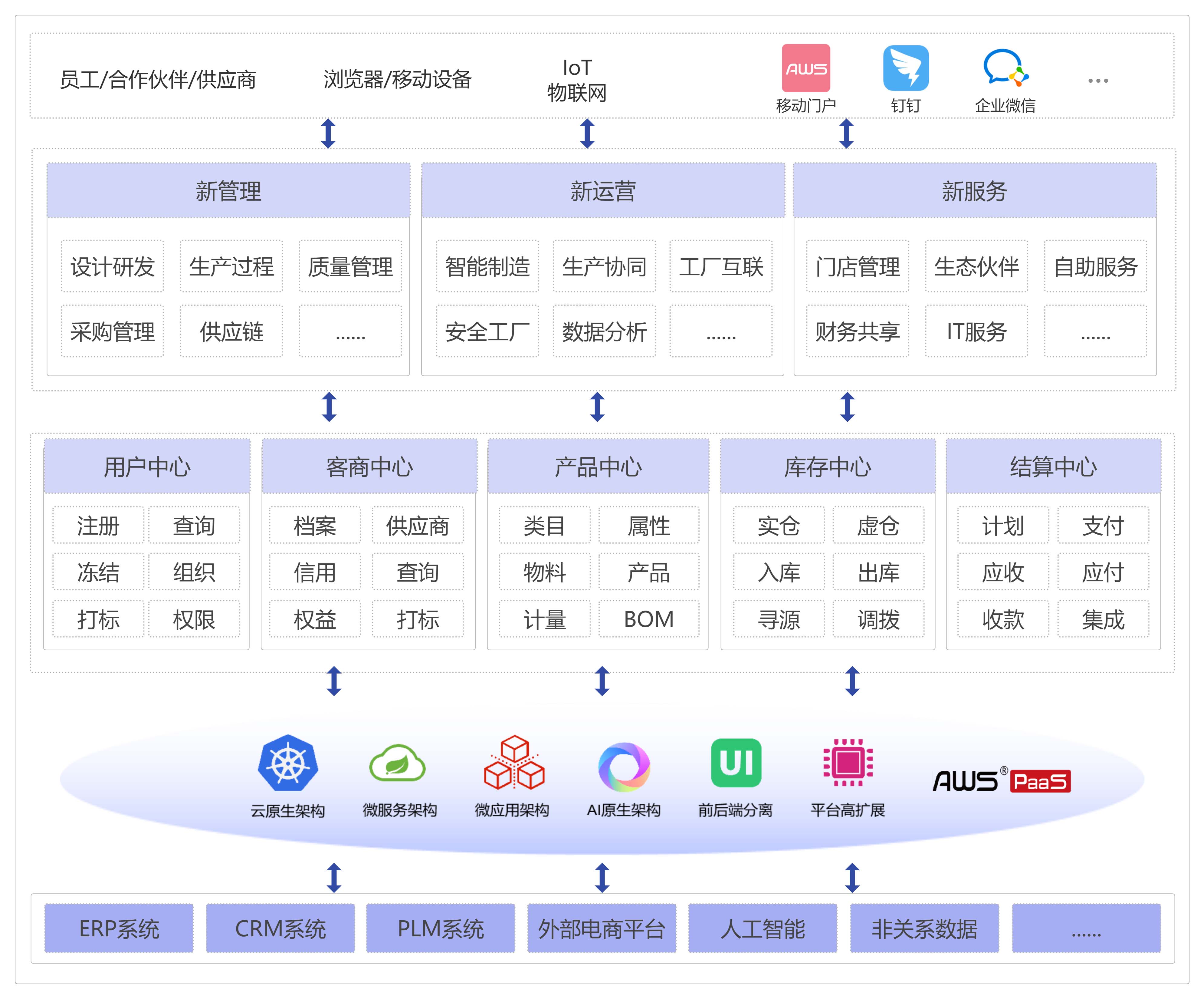 基于云原生与微服务架构,融合ERP、CRM、PLM及电商数据,覆盖设计、采购、生产、质量等全流程。通过IoT与AI技术,提升生产智能化,确保过程透明可追溯,全面优化运营效率与管理效能。