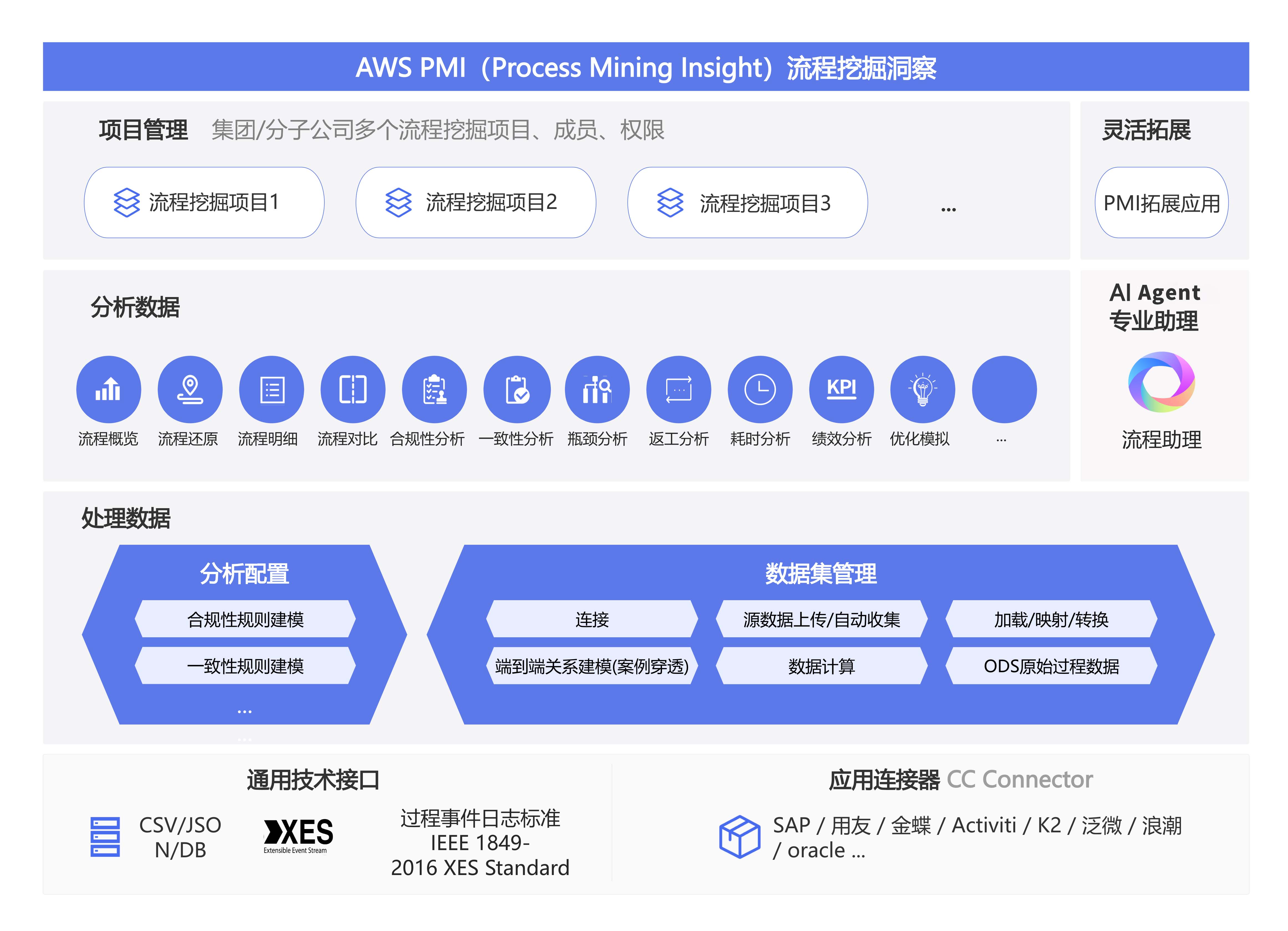 基于ERP、CRM、MES、OA等各业务系统沉淀的事件日志,逆向还原成真实业务流程,以便发现问题和优化机会,并采取有效的方案行动来改善流程和提高效率。帮助企业了解内部流程运行情况,明确流程变革方向。