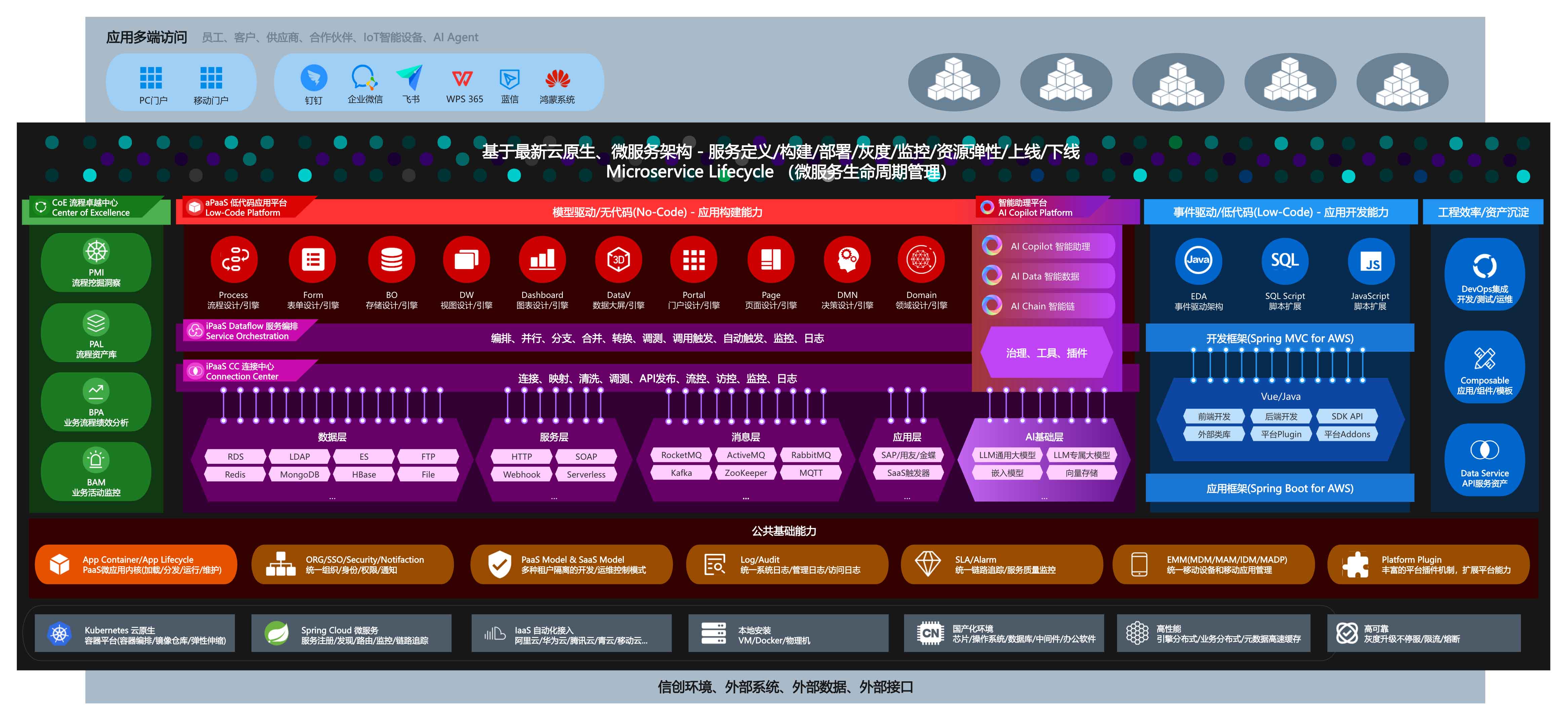 通过低代码和BPM快速搭建业务应用,云原生架构下的aPaaS智能运维能力,简化应用的开发、运行和维护;
