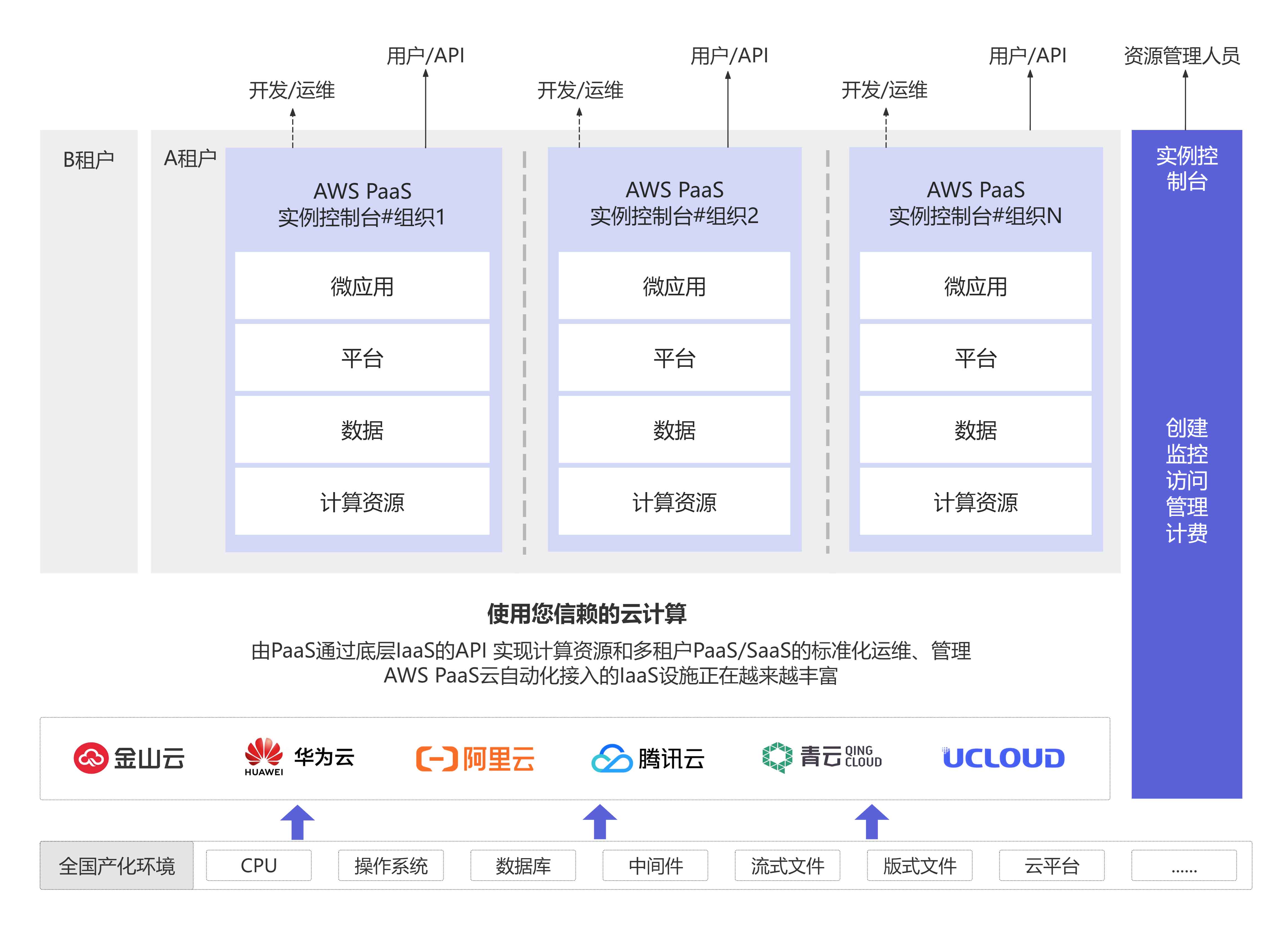 基于Kubernetes API封装的AWS KubeCloud组件,产品级融入客户在公有云或私有数据中心的容器平台,提供开箱即用、多租户管理的aPaaS开发/运维能力。适配于已拥有K8S或IaaS基础,多租户PaaS平台的统一能力建设。