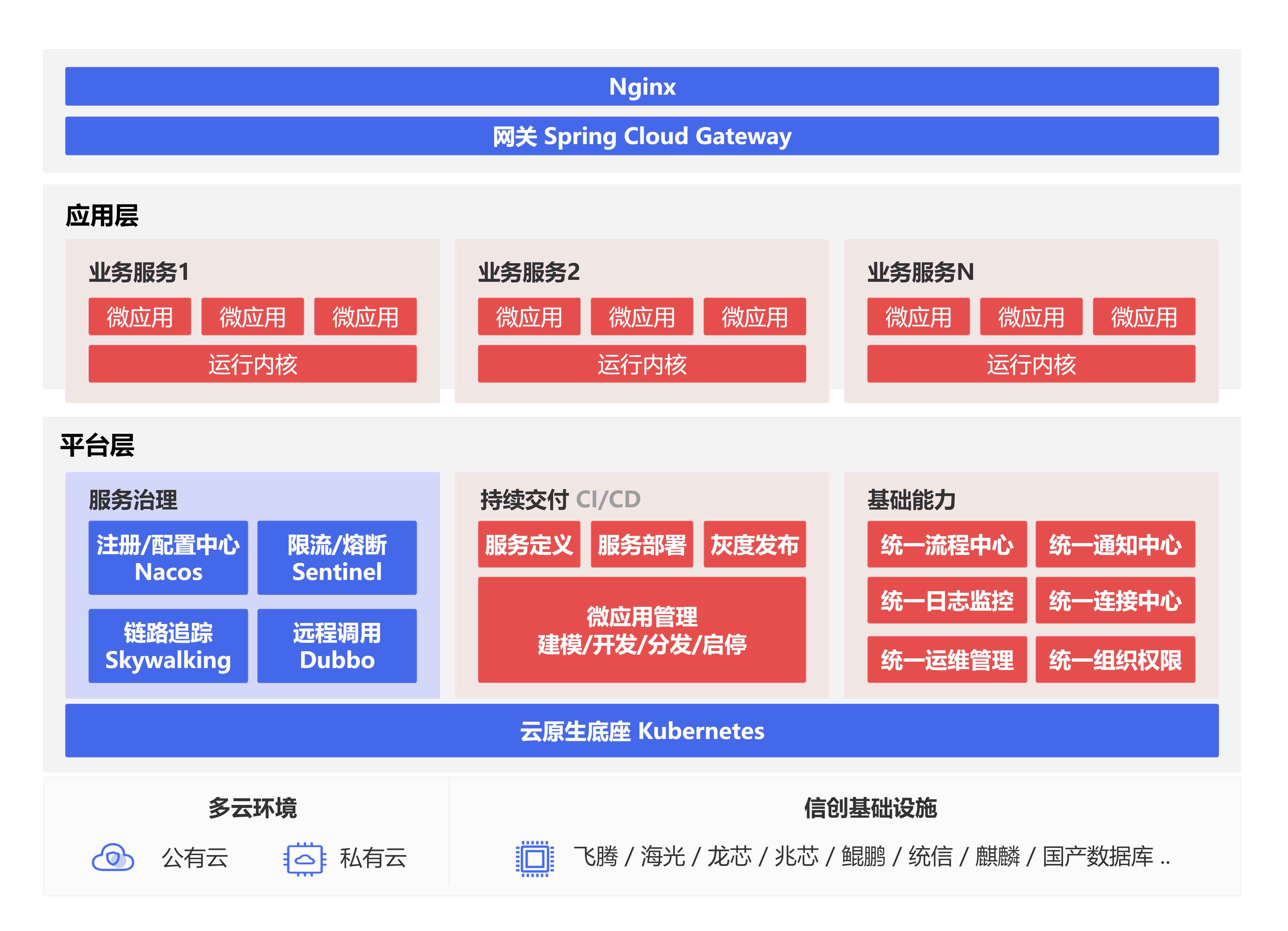 全栈适配国产 CPU、操作系统、数据库、中间件、云服务等近百家主流软硬件生态环境,帮助用户提前完成大量信创底层兼容认证,以及复杂技术路线的整合。提供从应用构建、运行、维护、升降级的全生命周期管理。适合金融、党政机关、国防军工、科研院所及央企、国企等对数据安全性、合规性要求较高的机构。